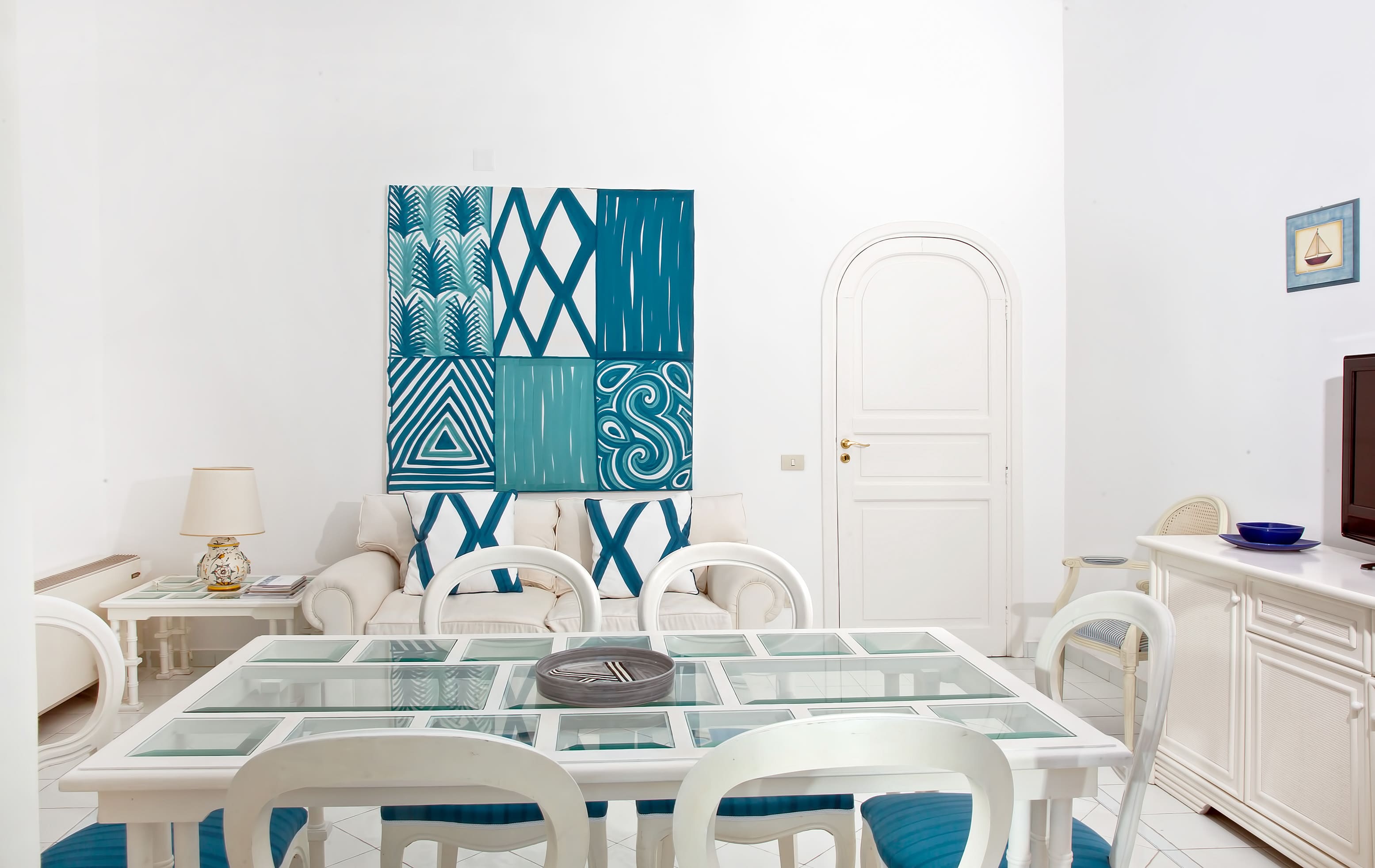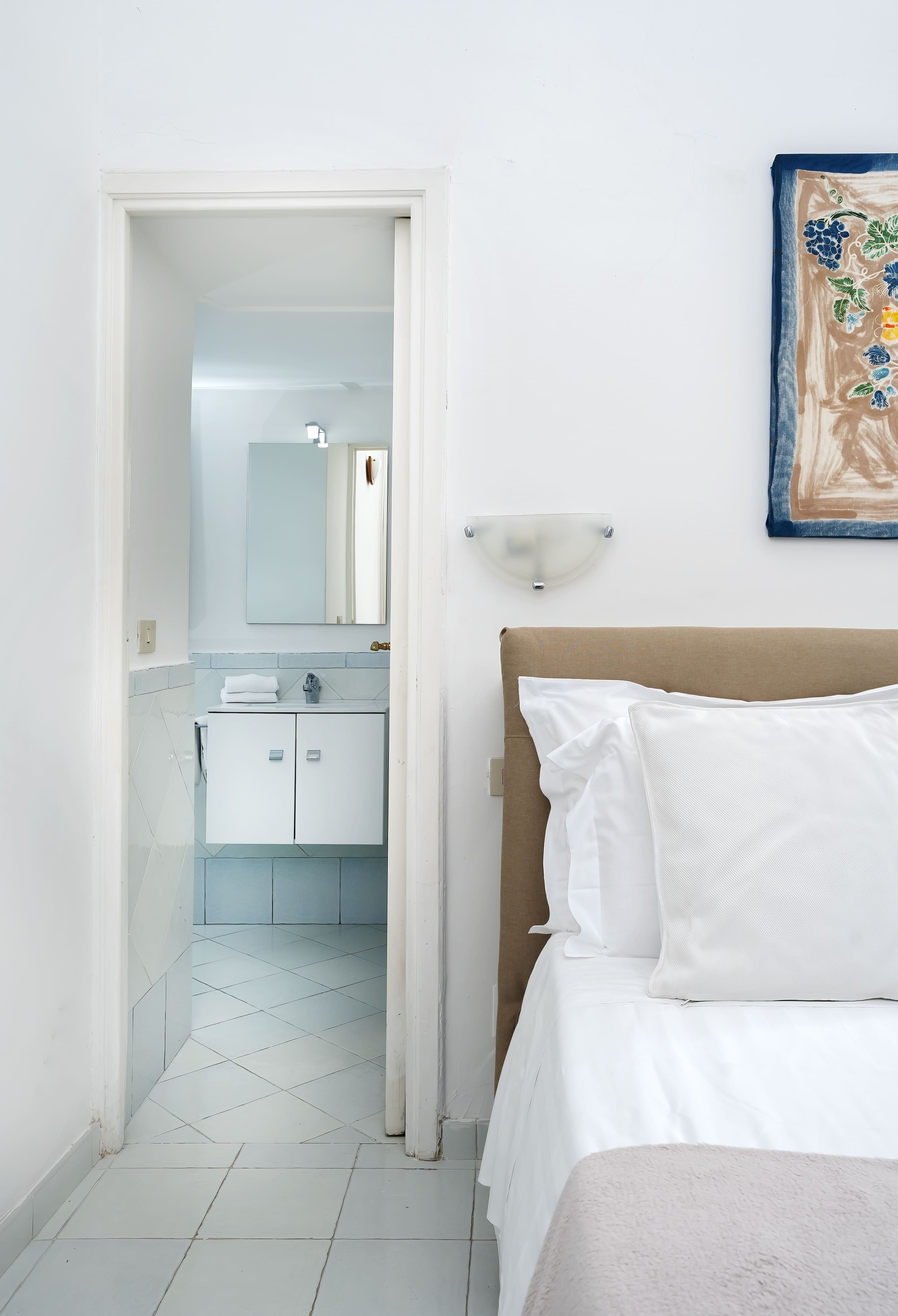L’interno si apre su un soggiorno luminoso che conduce a un portico privato con vista su Marina Piccola, perfetto per colazioni all’aperto o momenti di relax. L’appartamento dispone di due camere da letto matrimoniali, entrambe con bagno privato, garantendo privacy e comfort per tutti gli ospiti.