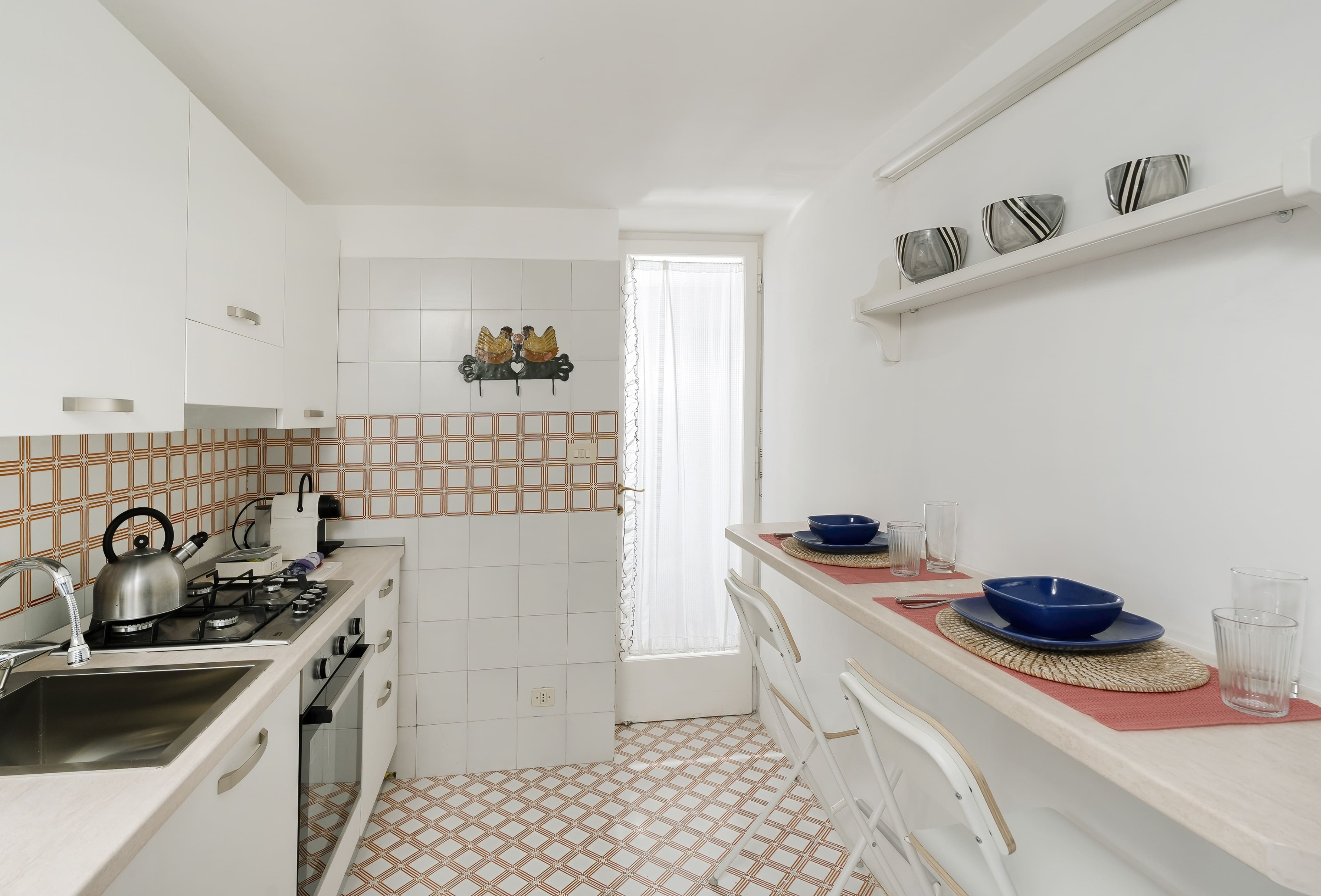 La cucina è completamente attrezzata con frigorifero, lavastoviglie, forno e stoviglie. Un secondo terrazzino ospita la lavatrice e offre uno spazio utile come ripostiglio.